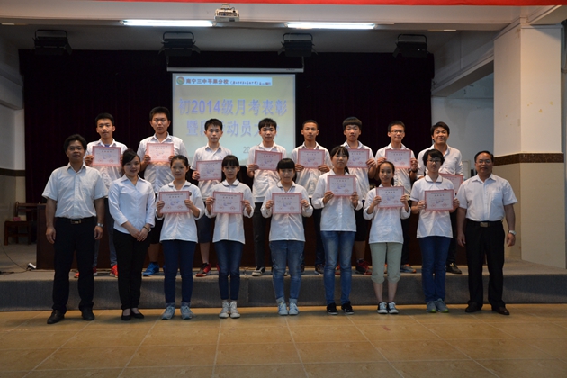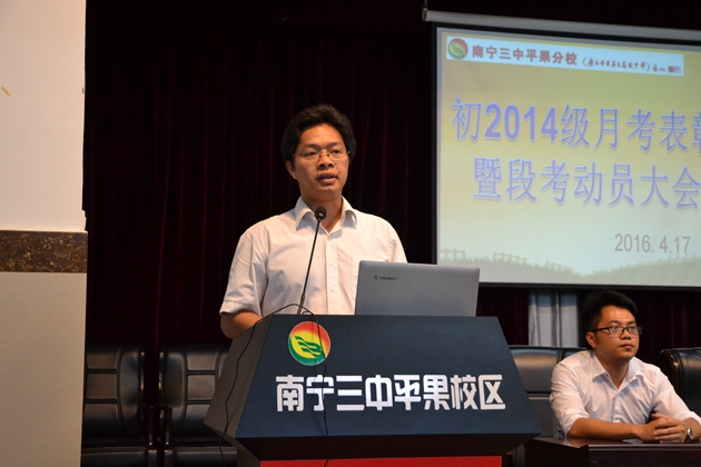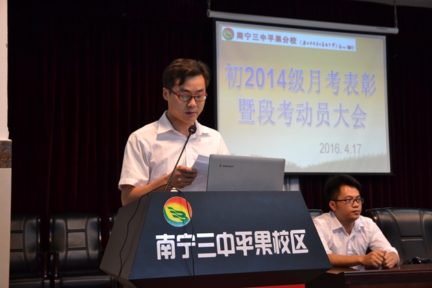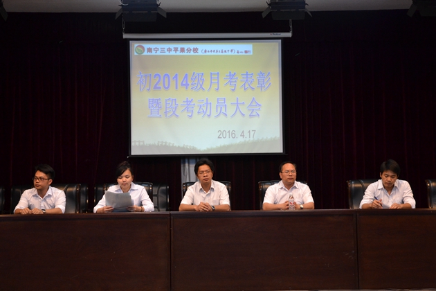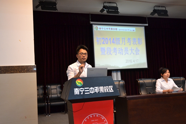 2016年4月17日,初二年级在学校报告厅召开本学期第一次月考表彰暨段考动员大会。初二年级全体师生出席了此次会议。