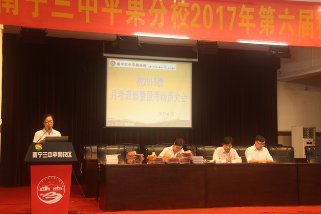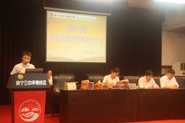 4月12日晚18:40,我校初2015级全体师生在学校报告厅召开了本学期第一次月考表彰暨期考动员大会。年级领导阮国辉主任及彭玲玲组长、李贤伟副组长参加了本次大会,大会由黄海慧老师主持。