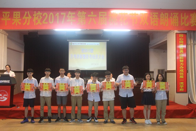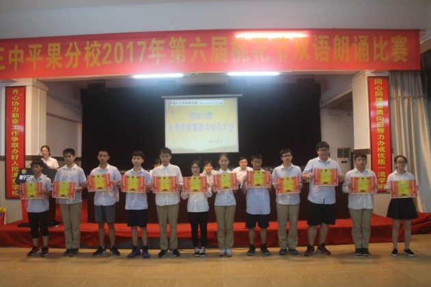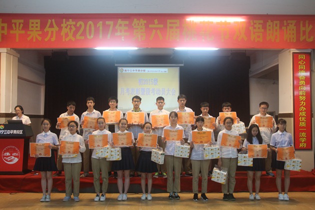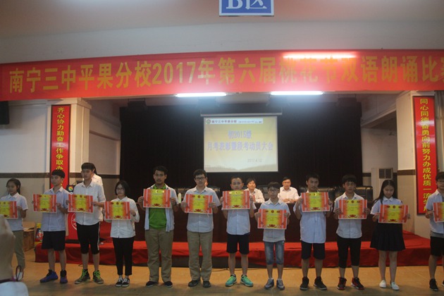 第一项议程是进步生代表梁诗霖发言,分享了他独特的学习方式。接着黄海慧老师宣布月考进步生名单,由科任老师给他们颁发奖状。其次是优秀生代表张景云上台发言,和同学们一起分析成绩退步的原因并找出解决方案,提醒大家明确目标、不懈努力。紧接着黄海慧老师宣布本次月考的优秀奖、三等奖、二等奖和一等奖,由阮国辉主任、彭玲玲组长、李贤伟副组长及各任课老师为学生颁奖。