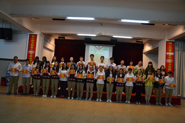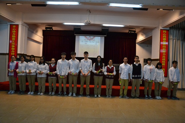 大会议程的第一项,进行表彰。由高二(3)班的农晓芸同学宣布获得高二上学期期考成绩优秀的孙宇东、农世霖、农晓芸、甘甜等28名同学名单,由年级颁发奖状和奖品。接着由高二(4)班卢丽雯同学宣读获得上学期期考成绩进步奖的余燕妮、农玉、郑斯宇等31名同学名单,年级颁发了奖状和奖品。年级此次还设立了一个特别奖,奖励了在每次考试中均独占鳌头的高二(1)班的孙宇东同学,年级领导陈可发老师为他颁发了奖品。最后,表彰的是为年级管理做出贡献的“年级自主管理委员会的同学们,感谢他们为年级的纪律管理所做的工作。