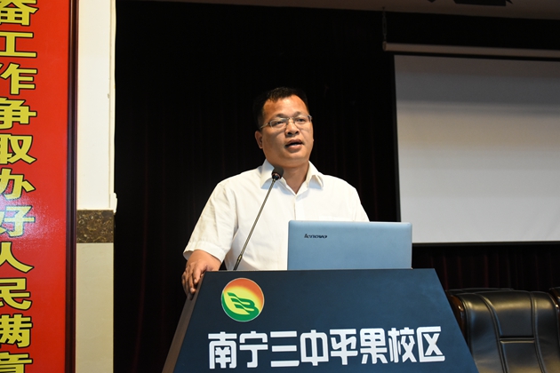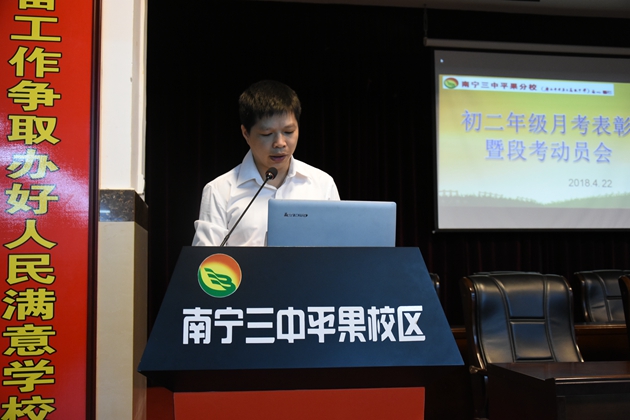 2018年4月22日晚7:00,初2016级全体师生在学校报告厅召开了本学期第一次月考表彰暨期考动员大会。校后勤主任潘忠峻老师、学校后勤副主任李华强老师、年级组长农海涛老师、黄艳娥老师等年级领导出席了会议。