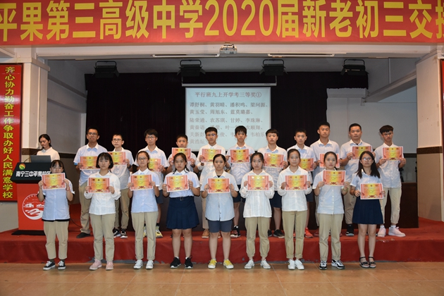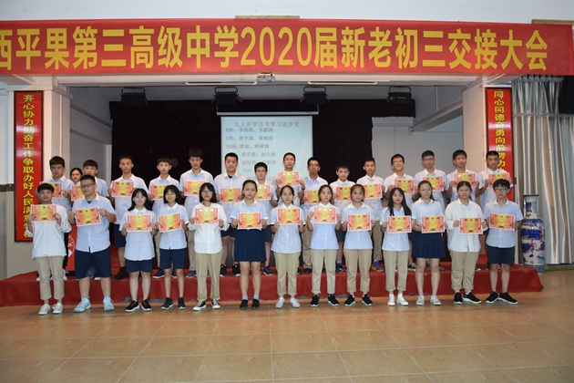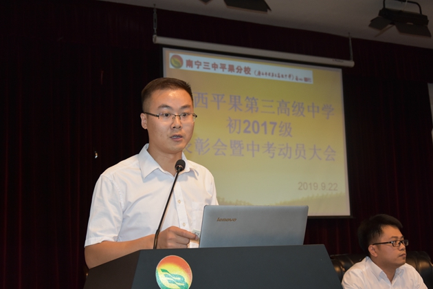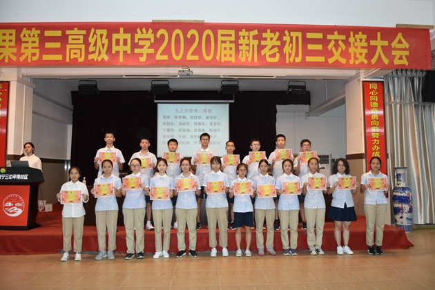 2019年9月22日晚,初三年级在学校报告厅召开了本学期开学考总结表彰暨中考备考动员会。初三年级全体师生出席了此次会议。