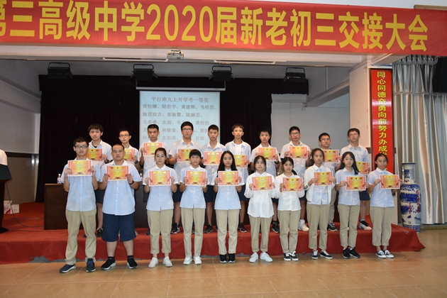 会议由年级组长黄敏老师主持。会议共有四项议程,首先由初三9班的优秀生代表黎思琹同学发言,黎思琹同学跟全年级同学分享了各科的学习方法并强调了良好的作息习惯是成功的前提。接着玉霞老师宣布了获得2018-2019学年度下学期“三好学生”“优秀班干”荣誉称号的学生名单和在开学考中获得进步奖和一、二、三等奖的同学名单,并依次对获奖学生进行颁奖。之后由黄炳程老师对年级检查人员和在年级羽毛球比赛中表现突出的班级进行颁奖。