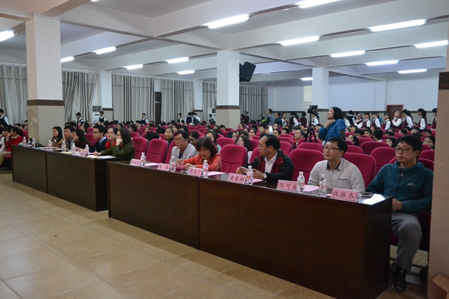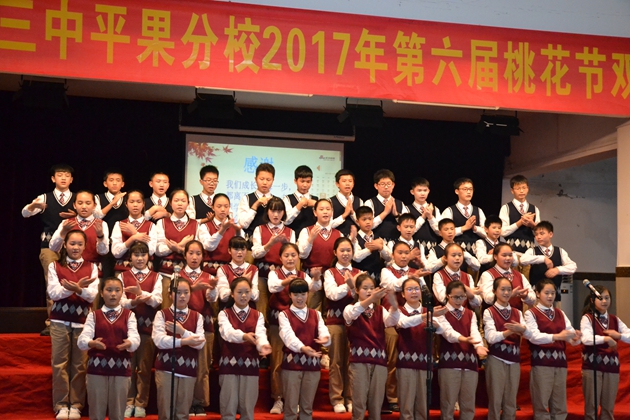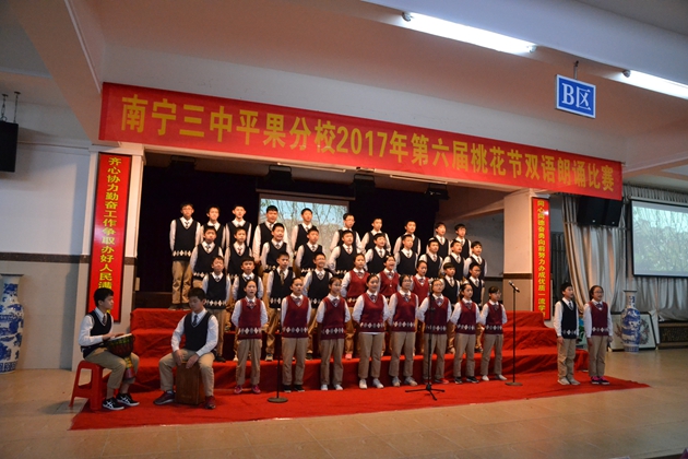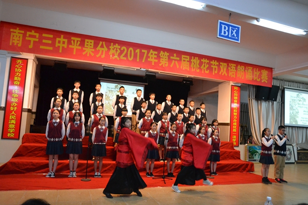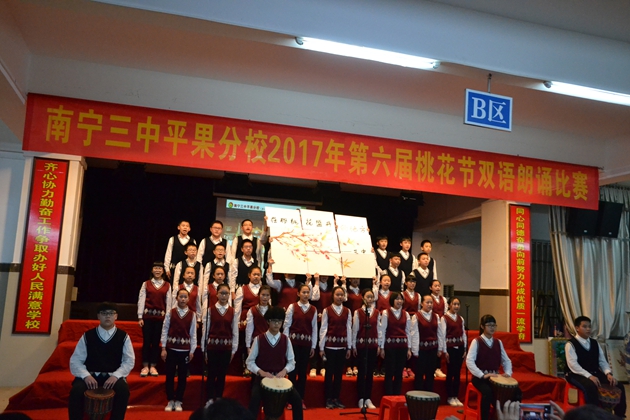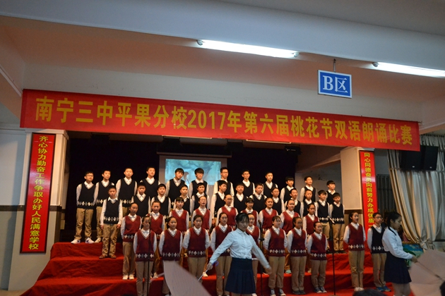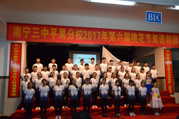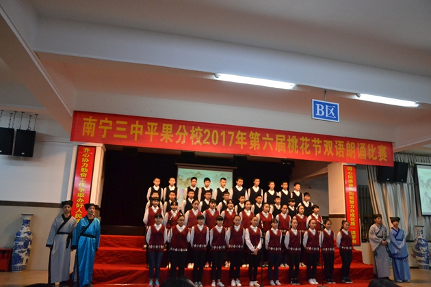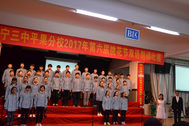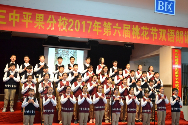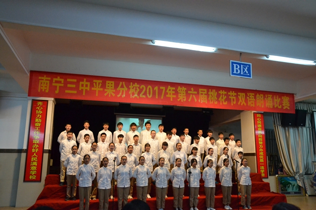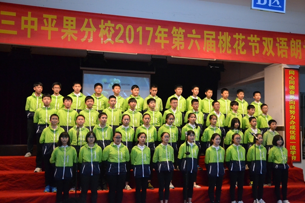 在这春暖花开,百花齐放的春天,我校迎来了传统的 “桃花节”双语朗诵比赛。3月22日晚7:30分,第六届“桃花节”双语朗诵比赛初中组比赛在我校报告厅举行。初一年级全体同学参加比赛。到场观看比赛的校领导有黄尚泽董事长、扬敏校长、高文广常务副校长、黄春彬副校长、学生处林振冬主任。