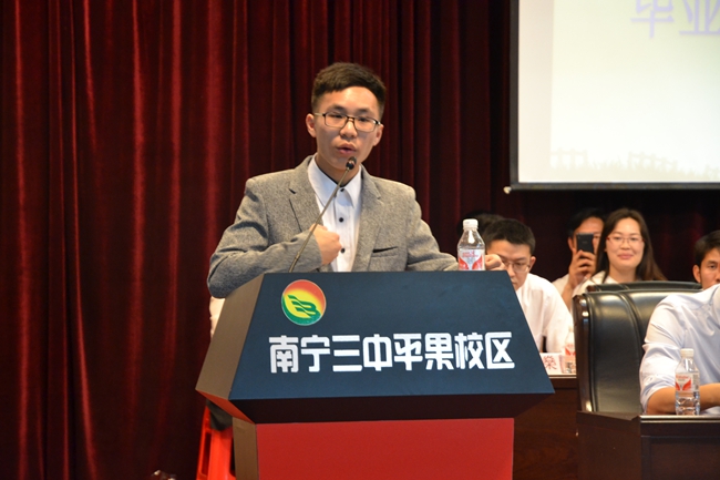 大会议程的第三项,由毕业生代表高三(6)班的凌志同学发言。凌志同学首先代表全体高三学生对老师们表示了感谢。感谢老师们在三年的时间里为大家点亮学海的灯塔,引领同学们走入知识的殿堂。在一千多个日日夜夜里陪伴大家成长。在高考即将到来之际,我们每个同学应该为自己心中的梦想努力奋斗!为了实现心中的梦想,在剩下的时间里同学们更应该抓紧每一分每一秒,坚持到高考的那一刻,在高考结束后,能对自己说一声:“我奋斗、我拼博,我无悔于我的高中生涯!”