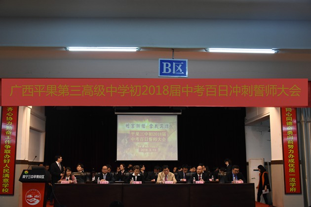 3月13日晚7点30分,我校在报告厅隆重举行初2018届中考百日冲刺誓师大会。出席大会的领导有黄尚泽董事长、杨敏校长、高文广常务副校长、黄春彬副校长以及学校各部门主任,初三全体教师和学生。大会由科研处主任阮国辉老师主持。