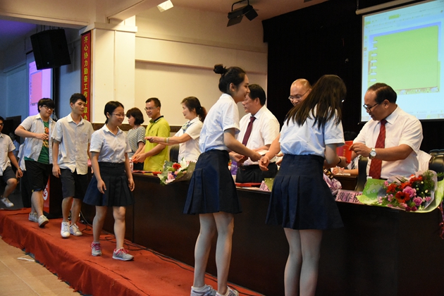 大会的第四项议程,由学生代表给高三老师献花。通过一朵朵美丽的鲜花传递了同学们对老师的深深感谢和诚挚的祝福。