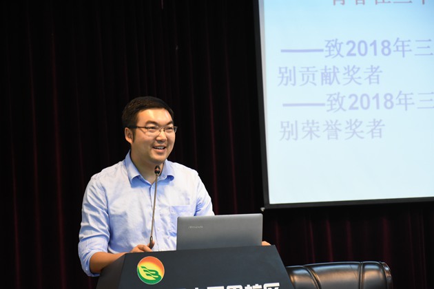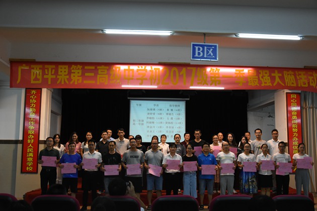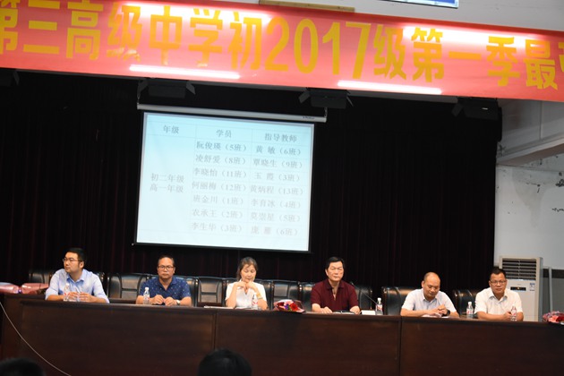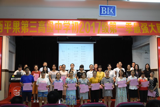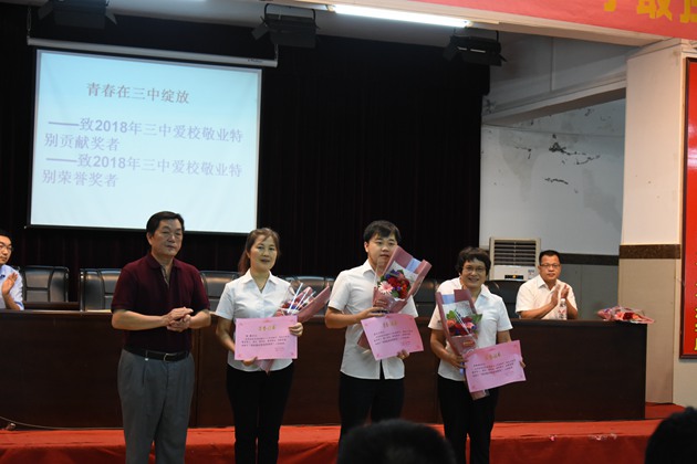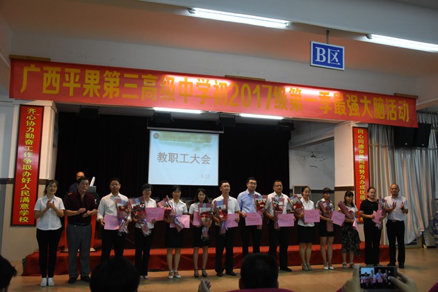 首先进行的是“爱岗敬业奖”颁奖仪式。黄春彬副校长宣布学校的表彰决定。首先颁发的是“爱校敬业特别贡献奖”。此奖项用以表彰杨琦等12名为我校发展默默付出和辛劳工作的教师。接着颁发的是“爱校敬业特别荣誉奖”,用以表彰南宁三中本部到我校任教的杨敏校长、张文江主任和李鲜妹主任。他们为我校的教育教学发展不辞辛劳,两地奔波。他们在工作中的全心投入、踏实肯干、重视细节的作风值得我们每一位老师学习。接着,杨琦主任代表获奖教师发表获奖感言。杨琦主任首先回顾了自己来到三中10年来的心路历程以及学校的发展变化。随后杨琦主任从感恩和感谢两个方面做发言。感恩三中,感恩黄尚泽董事长,三中和董事长给老师们提出了一个施展自己的舞台,让大家快速地成长;感谢在座的各位老师们在三中的大家庭里互相帮助,共同成长。期待大家一起投身于学校的建设,将三中的品牌树立起来,创造更美好的未来。