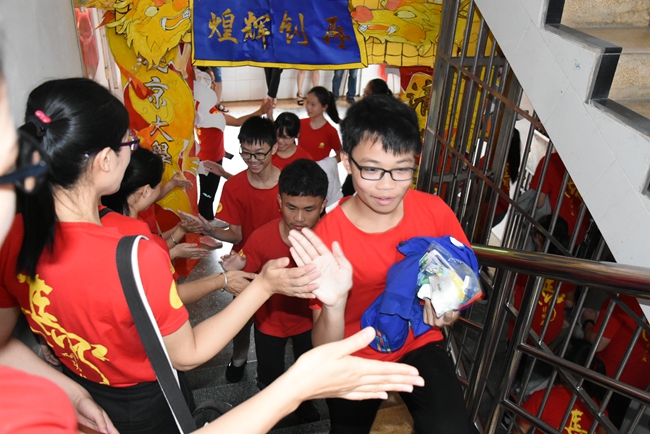 老师们在教学楼旁列队,和每一位走过“龙门”的同学握手、击掌,叮嘱他们要沉着自信,仔细答题,尽情发挥,祝福他们在中考中考出好成绩!