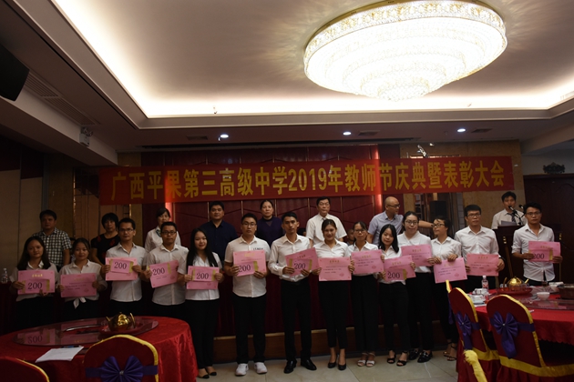 2019年9月6日晚,我校隆重举行2019年教师节庆典暨表彰大会。在主席台就坐的领导和嘉宾有平果县委常委、宣传部长、副县长黄萍女士、南宁三中贾应锋副校长、县教育局局长张建灵先生、平果县教育工委书记李小荣女士、平果县教育局周标亮副局长、平果县教育局宋志伟副局长、县教育局陆良根副局长、平果县各中小学校长和我校黄尚泽董事长、杨敏校长、高文广常务副校长、黄春彬副校长、杨琦副校长。我校全体教师员工出席了大会。本次大会由高文广常务副校长主持。
