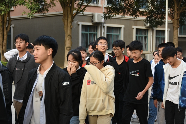 随着一声“着火啦……”消防疏散开始了,位于学校教学楼主要消防通道的楼道里烟雾缭绕,消防警报骤然响起。演练的学生在疏导老师的指挥下,采用捂住口鼻,弯腰低姿等方式,有序的从教学楼由一层到五层的顺序快速疏散,在操场指定的位置集合,各年级清点人数,汇报疏散情况,医护组做好了急救准备;宿舍楼各楼梯口、安全出口、转弯处均安排了人员指引疏散路线,整个疏散过程自始至终井然有序。