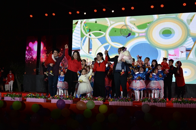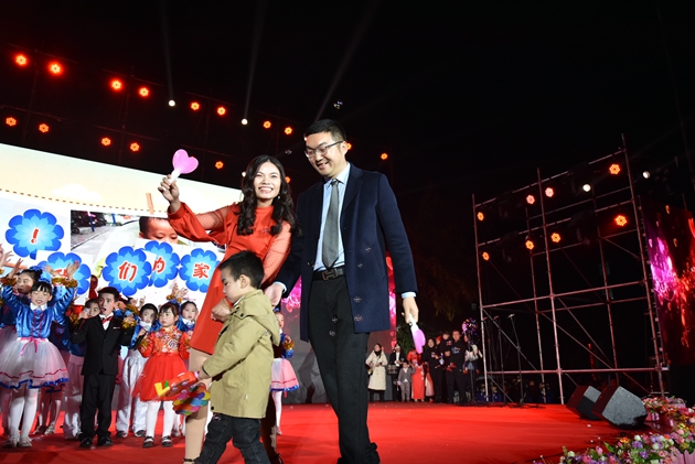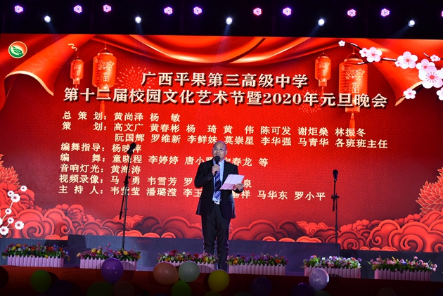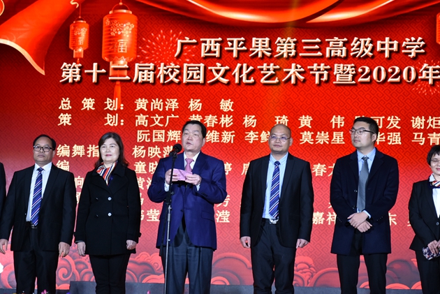 高文广常务副校长的致辞拉开了艺术节活动的帷幕。高文广常务副校长为大家介绍了到场嘉宾及领导。随后,黄尚泽董事长带领我校中层以上领导干部上台给全体参加晚会的领导、家长和同学们拜年,感谢大家一年来对三中的支持,让我们学校在这一年里获得了优异的成绩。领导们祝福大家在新的一年里工作顺利、身体健康、阖家幸福!最后,黄尚泽董事长宣布晚会开始,拉开了晚会序幕。