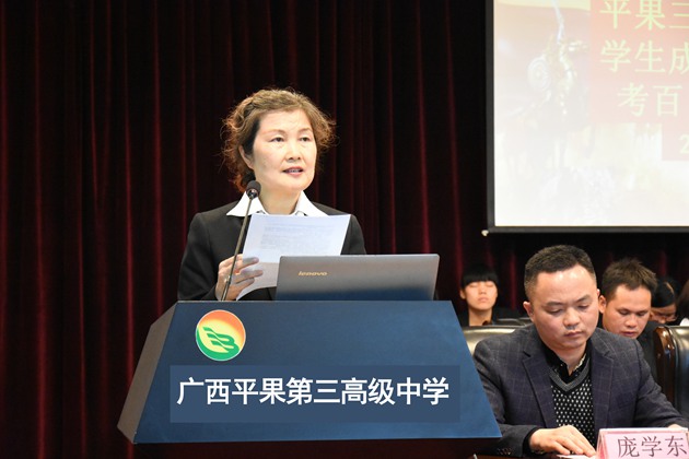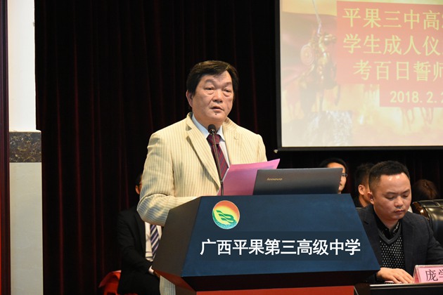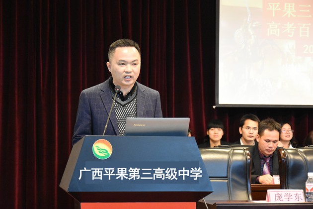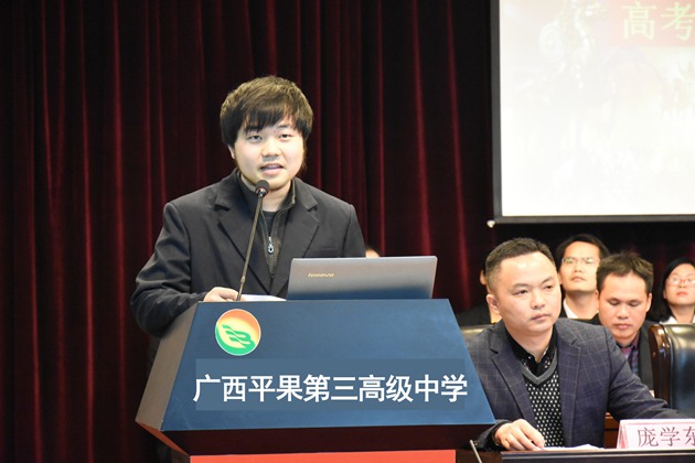 大会议程的第四项,由家长代表庞学东先生发言。庞先生首先感谢学校和老师们对孩子们的培育。在这一场高考的大战中,家长永远是孩子们最坚定的支持者,家长永远爱我们的孩子,只希望孩子们在面对高考的时候,能竭尽全力,无愧于学校老师和家长,无悔于自己的青春岁月。最后,庞先生祝愿所有的同学在高考中金榜题名,祝平果三中在高考中再创辉煌。