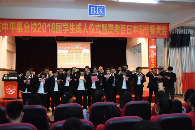 首先全体师生奏唱中华人民共和国国歌,之后由高三(3)班刘炫君同学带领全体高三学生面对国旗宣成人誓。