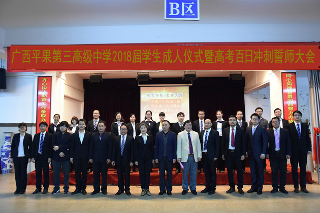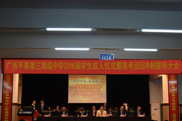 2月27日晚7点30分,我校在报告厅隆重举行2018届学生成人仪式暨高考百日冲刺誓师大会。出席大会的领导有黄尚泽董事长、杨敏校长、高文广常务副校长、黄春彬副校长以及学校各部门主任,高三全体教师和学生。大会由教务处主任黄伟老师主持。