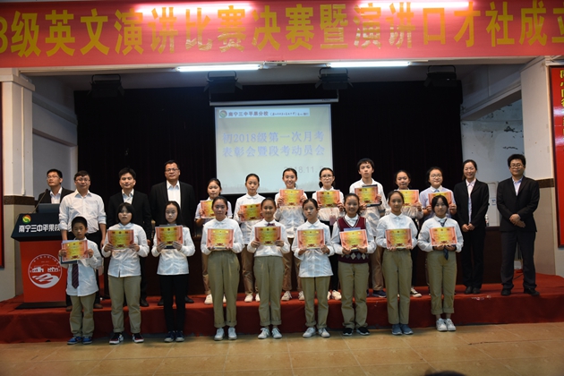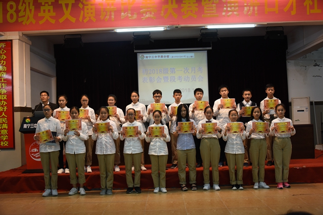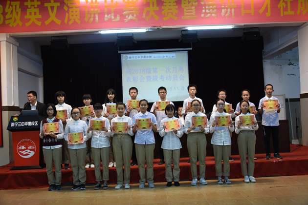 接着由陈炎锋老师公布第一次月考表彰学生名单,并由领导颁发奖状。陈老师在肯定同学们进步的同时也提出了新的要求:过去的荣誉已经过去,没有获奖的同学争取在段考中取得好成绩,获奖的同学不要骄傲,争取更大的进步。