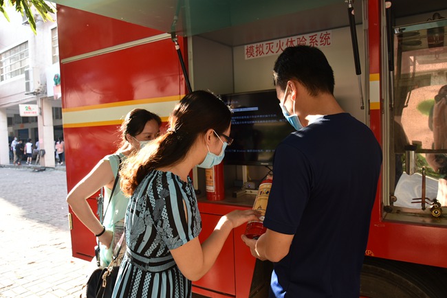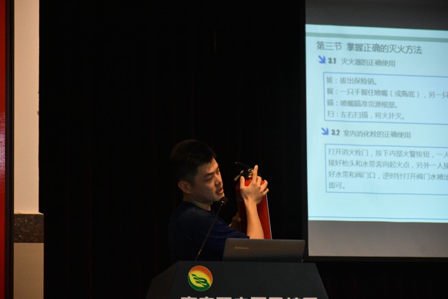邱指导员先向大家讲述了一些火灾的案列,让我们了解消防安全常识,掌握灭火、疏散、逃生的技能,提高自防自救的能力,并能预防火灾的发生。通过讲座,让大家对日常生活中的一些不良习惯也会造成火灾隐患有了更好的认识。呼吁大家提高消防意识,关爱生命。随后教官又针对家庭中火灾的主要类型——电火灾,燃气,煤气做了重点讲解,教给了老师们防范的基本常识,提高了火灾防范和火场逃生的自我保护能力。最后教官向我们介绍了各种消防器材的使用方法,学到了如何应对突发的火情。
