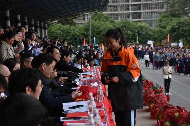 入场仪式结束后,高文广常务副校长宣布会徽设计获奖的同学名单,领导们为这些同学颁发了荣誉证书和奖金。接着,杨敏校长为本届校运会致辞。杨校长首先感谢对本次校运会筹备工作付出辛勤劳动的全校师生。她希望同学们发扬阳光体育精神,在竞赛中获得快乐,在快乐中获得友谊,展示我校学子的健康体魄,培养顽强拼搏,不畏挫折的精神。秉承友谊第一,比赛第二的宗旨,赛出风格,赛出水平!随后,运动员代表宣誓,在比赛过程中要做到公平竞赛,赛出自己的最好成绩!裁判员代表也做了宣誓,将恪守体育道德,严格裁判。最后,由黄尚泽董事长宣布:18luck娱乐第十六届校运会开幕!接下来运动会将正式进去比赛环节。