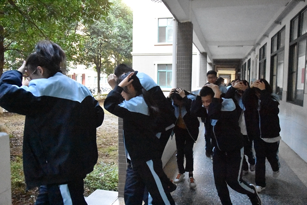 随着信号员发出“地震/消防报警”信号消防演练开始了,班主任告知学生“地震来了,不要惊慌”,并指挥学生迅速抱头、闭眼,躲在书桌或教室三角地带,并尽可能用手或书包抱住头部。随后,信号员发出解除“地震警报”信号,震波已过,因地震导致火灾发生。位于学校教学楼主要消防通道的楼道里烟雾缭绕,消防警报骤然响起。演练的学生在疏导老师的指挥下,采用捂住口鼻,弯腰低姿等方式,有序的从宿舍楼快速疏散。教学楼各楼梯口、安全出口、转弯处均安排了人员指引疏散路线。学生们在老师的引导下来到操场指定的位置集合,各年级清点人数,汇报疏散情况,医护组做好了急救准备,整个疏散过程自始至终井然有序。