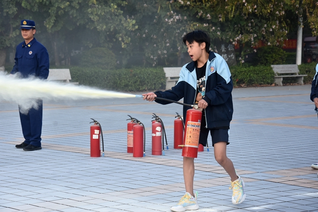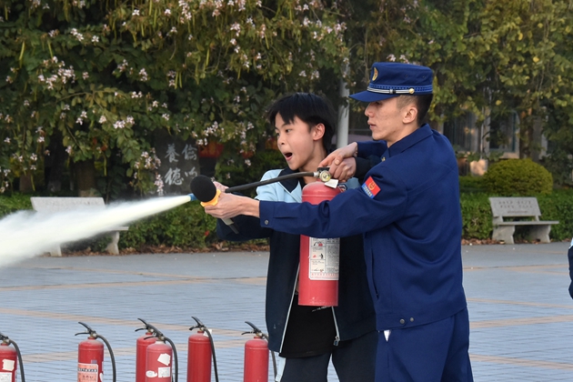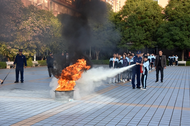到达操场后,校党支部罗维新书记首先就疏散情况做了小结。罗书记对学生们演练的表现表示肯定,并对学生们传授了一些关于地震、火灾时的安全知识,告诉大家灾难来临应保持沉着冷静,在日常生活中也应减少安全隐患,防患于未来。接着由平果市应急消防大队覃伟同志给全校师生讲解一些关于如何灭火的知识,他结合典型的火灾案例,用通俗易懂、贴近生活的语言向大家详细讲解了校园火灾扑救方法、火灾现场逃离方法、校园内发生火灾的原因等知识,提醒师生们把消防知识应用到实际生活中去,时刻提高警惕,千万不可麻痹大意。演练的最后,还邀请学校保卫科的工作人员和生活老师、学生代表亲自使用了灭火器进行灭火演示。
