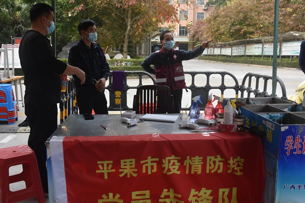 根据《百色市新冠肺炎疫情防控指挥部关于印发百色市2022年春季学期学校错时开学学生错峰返校工作方案的通知》(百新冠防指〔2022〕23号)文件精神,我市2022年春季学期实行错时错峰开学。为了严格遵守“疫情没有得到有效控制前不开学,学校基本防控条件不具备不开学,师生和校园公共卫生安全得不到保障不开学”的原则,精心谋划学校开学工作,科学、周密组织师生返校,加强校园管理和日常疫情防控,确保2022年春季学期开学安全。平果市教育局基教股常务副股长兰婕、项目办常务副主任唐敏强、市疾控中心健教科副科长黄鹏珍等领导到我校就2022年春季学期开学条件进行实地核验。我校杨敏校长、黄春彬副校长等学校领导陪同局领导进行各项检查。