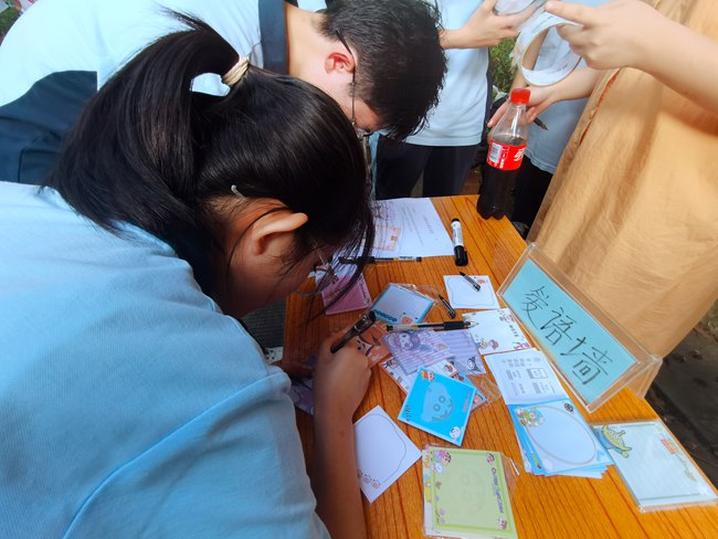 此次心理游园会活动共设置4个关卡,每一关卡都有其独特的任务。同学们通过完成所参加关卡的任务来获得“通关章”,并兑换相应的奖品。在谋略大作战中,同学们一鼓作气、信心满满地想要将兵乓球快速吹到终点,其他排队的同学跃跃欲试;“我找到了,这两个图是一样的”“你眼神真好,这么快就找到了”,从注意大作战那边传来了鼓掌的声音,走进一看、一位同学左手拿着一张塔宝牌,跟自己右手的塔宝牌进行对照,一看就马上找到了两张牌的共同图形,用自己的超强注意力快速完成了游戏,得到了围观同学的肯定。在游园关卡中,最受学生们欢迎的是给毕业班学长学姐加油的爱语墙,学生们纷纷用七彩贴纸写下自己的正能量留言,表达自己对学长学姐的祝愿和对学校的祝福,并在展板的一处写上了对自己的期待,展示了爱自己、爱他人的心理品质。