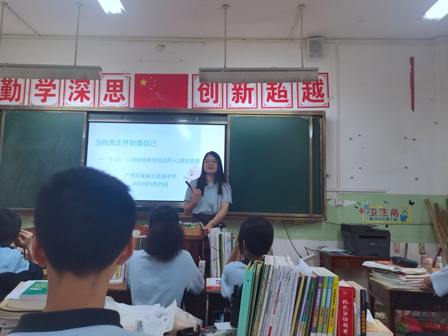 为了引导学生增强维护心理健康的意识,提高心理调适的能力,以积极的心态面对学习、生活中的困难和压力,有效应对各种心理危机,完善家校社协同,营造积极向上、健康和谐的校园文化氛围,展示新时代学生理性平和、积极向上的精神,2023年5月,广西平果第三高中中学在区级、市级领导部门的指导下,组织开展了心理健康教育系列活动,带动学生了解自我、关爱自我,在正向积极的青春里收获人生的果实。
