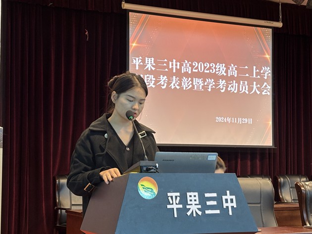 百轲争流千帆竞,标杆引领促前行。为表彰先进,树立榜样,促进优良学风的形成,同时激励和动员高二学生迎接即将到来的学考挑战,鼓舞信心,激发斗志,为学考做好充足准备。11月29日晚,高二年级在报告厅召开段考表彰暨学考动员大会。我校杨琦副校长、董事长助理兼党总支部书记罗维新、教务处副主任杨红燕、年级组长毛朝鸿、年级副组长李文卿、年级领导小组成员以及高2023级全体师生参加本次会议。
