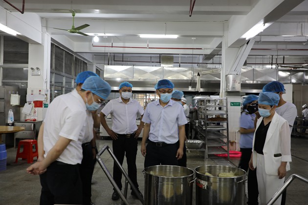 检查组一行在学校高文广校长、黄春彬副校长、董事长助理兼后勤处主任林振冬的陪同下,重点对学校食堂进行了细致检查。此次督导主要围绕“完善安全管理体系、抓好常态化防控、强化应急处置、加强宣传和培训”四个方面展开,旨在确保A级食品生产经营主体严格落实食品安全工作责任。