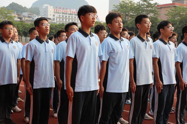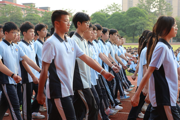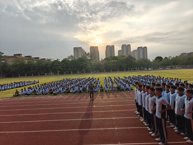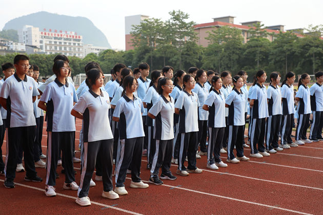 在精彩的军事技能展示后,在校歌伴奏声中,同学们深情演唱了校歌。悠扬而熟悉的旋律回荡在田径场上空,唱出了对学校的归属感与自豪感,表达了莘莘学子将以母校为荣、为母校争光的坚定决心。