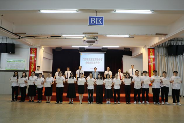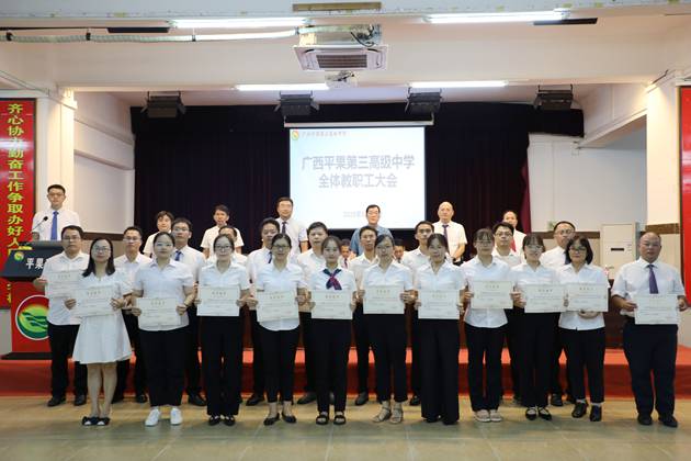 执卷育桃李,匠心传薪火。青年教师的每一步成长,都浸透着前辈的育人智慧;教育新人的每一次突破,都饱含着导师的倾囊相授。“青蓝同辉、共谱育人华章”,早已成为平果三中赓续不辍的教育基因。2024-2025学年,青蓝工程进展顺利,效果显著。大批青年教师在反复的“备课-磨课-上课-评课”中快速提升了教材解读、教学设计和课堂掌控的能力。科研处主任冶文军老师宣读“2024-2025学年度教师青蓝工程优秀指导教师”名单;科研处副主任农海涛老师宣读“2024-2025学年度教师青蓝工程优秀学员”名单;副校长兼学生处主任谢炬燊老师宣读“2024-2025学年度班主任青蓝工程优秀指导老师”名单;学生处副主任黄敏老师宣读“2024-2025学年度班主任青蓝工程优秀学员名单”,出席本次大会的校级领导为以上青蓝工程获奖的老师颁发荣誉证书。