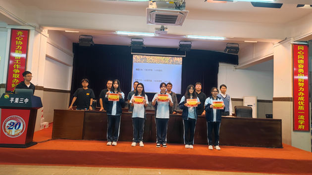时维十月,序属三秋。2024年10月26日晚,平果三中高2024级月考总结表彰大会在学校报告厅隆重召开。此次会议旨在彰先进、树典范、严学风、促成长,大会在庄严的国歌与激昂的校歌声中拉开帷幕,全体师生肃然而立,齐声高唱,展现出严谨务实、追求卓越的精神风貌。