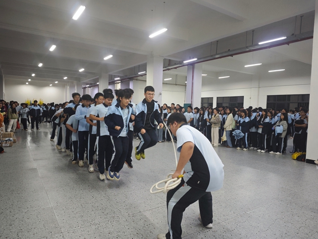 绳起如虹开胜景,人跃如燕踏长风。随着裁判员一声令下,长绳应哨声起舞,如银蛇腾空,划破凛冽寒风。摇绳者稳若磐石,执绳柄如握长虹,起落间把控全局;跳绳者轻似飞燕,迎着绳浪翩跹而过,脚步与绳韵相和。每一次起跳都是青春的音符,每一声计数都是奋进的节拍。“一二、一二”的整齐口号响彻操场,凝聚起千重声浪的磅礴气势,让凛冽寒风中的校园洋溢着滚烫的青春气息,感染着在场每一位师生。